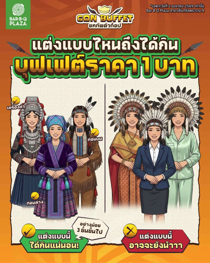 พี่ GON เติมสีสันช่วงโค้งสุดท้ายของโปรโมชัน “GON BUFFET ยกทัพตัวท็อป” ชวนแฟน ๆ มารวมพลในกิจกรรมพิเศษ “วันธงชัยเผ่าท้าชน” เปิดพื้นที่ให้แต่ละเผ่าแต่งชุดโชว์ไอเดียกันแบบจัดเต็ม ทั้งคอสตูมและเครื่องหัว พร้อมมอบสิทธิ์ 100 ท่านแรก ให้คุ้มสุดๆ กับ GON BUFFET ชุดรวมหมู เนื้อ และทะเล ที่รวมข้าว เครื่องดื่ม และไอศกรีมไม่อั้น ในราคาเพียง 1 บาท NET/คน จากปกติ 599 บาท NET/คน โดยกิจกรรมจัดขึ้น วันเดียว รอบเดียว ในวันที่ 2 เมษายน 2569 เฉพาะที่ ร้านบาร์บีคิวพลาซ่าสาขาเซ็นทรัล พระราม 9 เท่านั้น