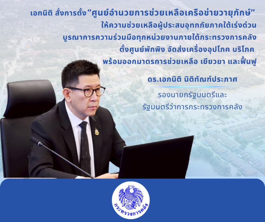 วันนี้ 27/11/2568 เวลา 08:20 น. ดร.เอกนิติ นิติทัณฑ์ประภาศ รองนายกรัฐมนตรีและรัฐมนตรีว่าการกระทรวงการคลัง สรุปนโยบายการให้ความช่วยเหลือผู้ประสบอุทกภัยในพื้นที่ภาคใต้ว่า กระทรวงการคลังได้มีการตั้ง “ศูนย์อำนวยการช่วยเหลือเครือข่ายวายุภักษ์” เพื่อให้ความช่วยเหลืออย่างเร่งด่วนแก่ผู้ประสบอุทกภัยในภาคใต้ โดยบูรณาการความร่วมมือกับทุกหน่วยงานภายใต้สังกัดกระทรวงการคลัง โดยมอบหมายให้นายลวรณ แสงสนิท ปลัดกระทรวงการคลัง เป็นประธานในการบูรณาการการปฏิบัติงาน ให้ทุกหน่วยงานในสังกัดนำกรอบการช่วยเหลือผู้ประสบภัย 3 ระยะ คือ “ช่วยเหลือ” “เยียวยา” และ “ฟื้นฟู” เร่งออกมาตรการให้ความช่วยเหลือประชาชนที่ได้รับผลกระทบจากอุทกภัยอย่างเป็นระบบ ตามขอบเขตความรับผิดชอบอย่างเต็มกำลัง โดยมีศูนย์อำนวยการช่วยเหลือเครือข่ายวายุภักษ์เป็นศูนย์กลางในการบริหารจัดการและติดตามสถานการณ์จากส่วนกลางอย่างใกล้ชิด